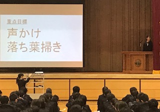 整美委員会で落ち葉掃きを行なっていますが、委員会だけでは手が足りないという事で、生徒朝礼でボランティアを募りました。その結果、95人の生徒からボランティアの希望がありました。天気が良ければ明日の朝から開始です。