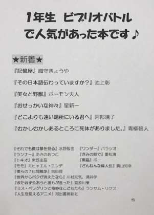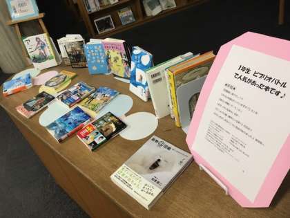 情報学習室に一年生が取り組んだビブリオバトルで人気があった本の展示がしてあります。来校された折に、手にとってみては如何ですか。