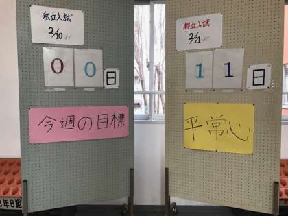 東京では今日から私学の一般入試が始まります。すでに、私立、都立の推薦入試は終わり、進学先を決めた生徒もいますが、まだ約7割の生徒が今日から始まる入試を受けます。体調管理を十分行い、良い結果を出せることを願っています。