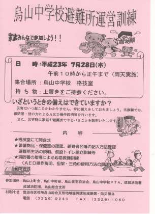 下記の要領で「烏山中学校避難所運営訓練」を行います。