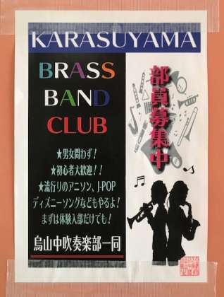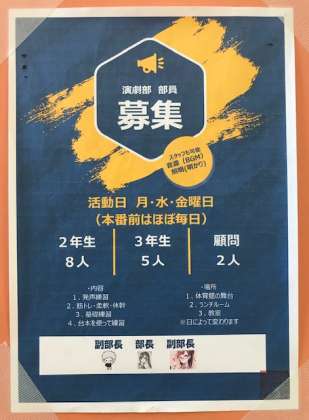 部によっては勧誘するためにポスターを作っています。吹奏楽部と演劇部のポスターが中央階段に貼られていました。