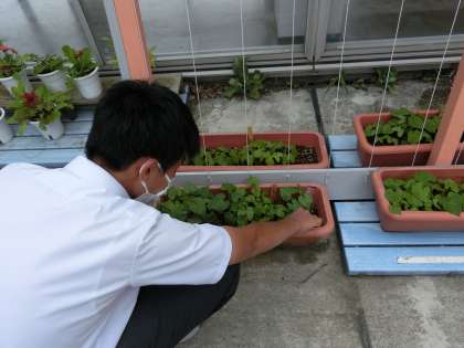 整美委員会SDGsの取り組み第1弾「グリーンカーテン」の植物の葉がたくさん茂ってきました。そろそろ葉の形で何の植物か分かって来たのではないでしょうか。※花が咲くまで名前は秘密です。
