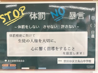 東京都教育委員会は都内全ての学校で体罰防止研修を行なっています。烏山中学校でも夏休みの初めに実施し、写真にあるような学校としてのスローガン「体罰根絶に向けて生徒の人権を大切に、心に響く指導をすることを宣言します!」を決め、日頃の指導にあたっています。