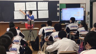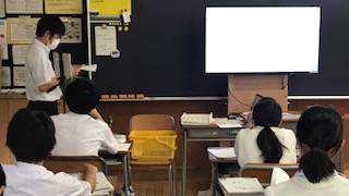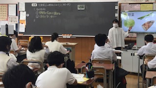 一部オンラインで授業に参加している生徒もいますが、写真は今日の授業の様子です。感染に十分注意した上で、話し合い学習もしています。写真の中に、オンライン配信のためにタブレットが設置されているのですが、どこにタブレットがあるかわかりますか?