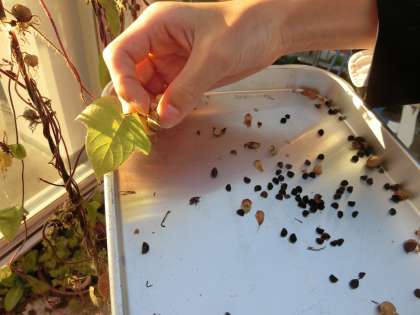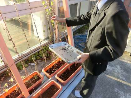 主事さんの指導のもと、整美委員がアサガオの種の収穫をしました。収穫した種は来年、グリーンカーテンを作るときに使用する予定です。