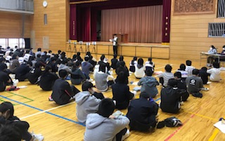 体育館で、1年生がビブリオバトルの学年代表者発表会を行いました。各学級から選ばれた代表5名が発表をしました。どの生徒も聞き手を引き込んでゆく滑らかな話し方で本の紹介ができました。