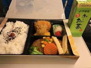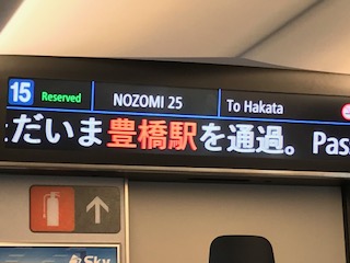 新幹線の中で昼食です。静かに弁当を食べています。少し前に、豊橋を通過しました。