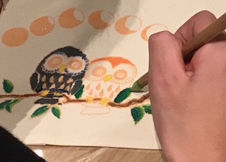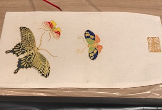 布に書かれた下書きに沿って丁寧に色をのせていくのですが、染料がはみ出さないように色をつけるのが難しい体験でした。最後に、金箔を輪郭におしてもらい完成です。完成すると素敵なバックカバーになります。