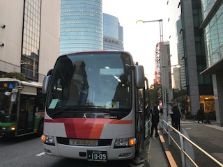 新幹線が17:08に品川に着き、バスに乗り換え、17:26にバスは学校に向け出発しました。