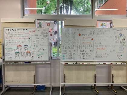 1階、生徒昇降口の前に、体育大会の予定等が記入されたホワイトボードが設置されています。予定だけでなく、名言やアドバイスなど工夫されています。