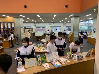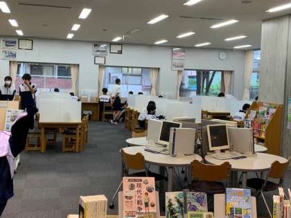 本日はあいにくの雨で、昼休みに校庭が使えません。情報学習室には沢山の生徒が本を読みに来ていました。今は、体育大会が近いので、陸上競技関係の本も入口のところに置かれています。読書の習慣は大切ですね。ぜひ多くの本に触れてほしいものです。