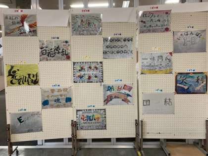 今年度の各クラスの体育大会のクラススローガンが、中央階段前に掲示してあります。明日は各クラスの思いを胸に、一致団結して臨んでほしいと思います。