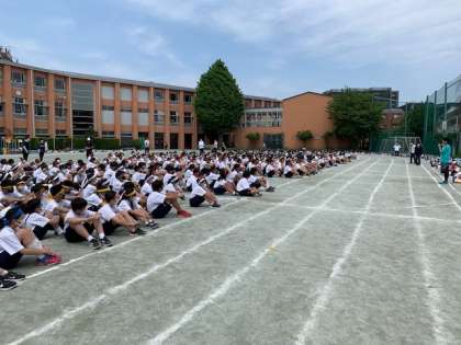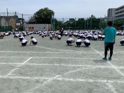 体育大会予行の後、校庭で活動している際に災害が起きた時の避難訓練を実施しました。避難の姿勢、注意点等について担当の先生から指導がありました。