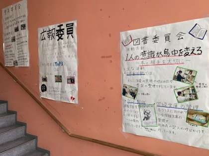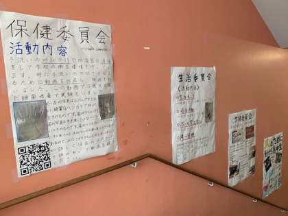 各委員会の活動方針、活動内容等が階段に掲示されています。