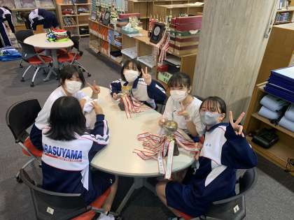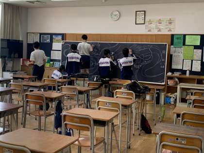 いよいよ明日が体育大会です。教室では黒板アートの作成中でした。2枚目は優勝カップを楽しそうに磨いていました。