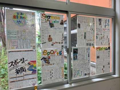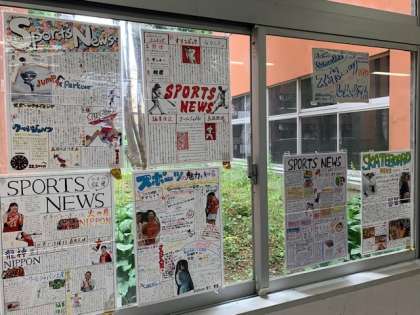 毎年、体育の夏休みの宿題で、スポーツ新聞を作成します。これまでの名作が掲示されています。どの新聞も力作揃いです。