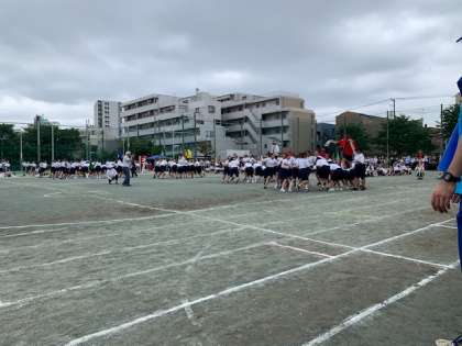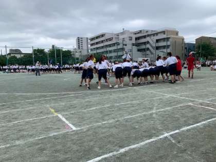1年学年種目『いかだ流し』です。いかにイカダを早く作れるか、船頭さんがそこを早く駆け抜けることができるかがポイントです。1位のクラス早かったですね。