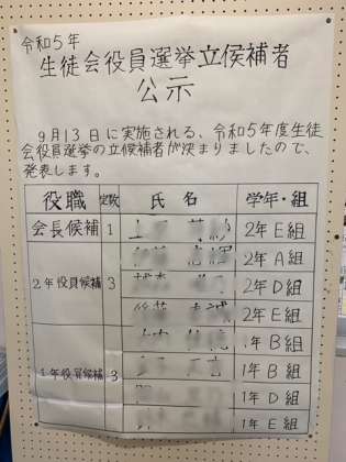13日に立会演説会があります。立候補者の選挙公示が掲示されています。