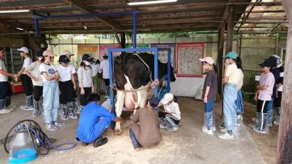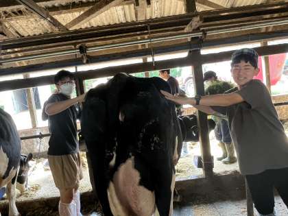 まず、乳牛についてのお話しを聞き、その後、乳搾り、牛のお世話、牧場見学をしました。