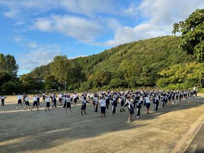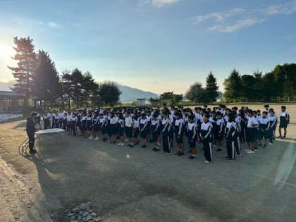 朝礼の様子です。皆体調も良さそうです。今日はオリエンテーリングとうどんづくりです。