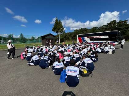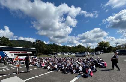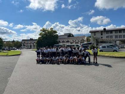 緑の休暇村でクラス写真。オリエンテーリングの説明を受け、これから出発します。