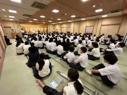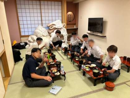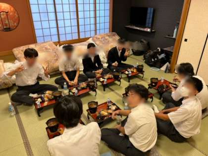 6時起床、朝礼の様子。体調が少し心配な生徒もいますが、今日は1日班行動です。朝食もしっかり食べました。
