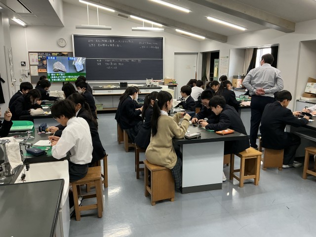 1年生の理科の授業で、初任者の先生の研究授業をおこないました。教材研究を工夫してわかりやすい授業改善に努めています。