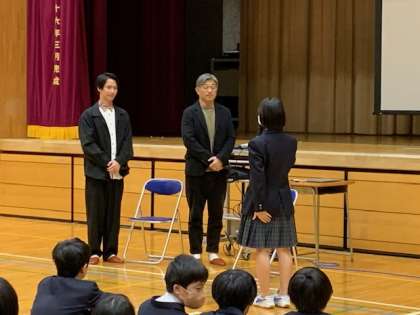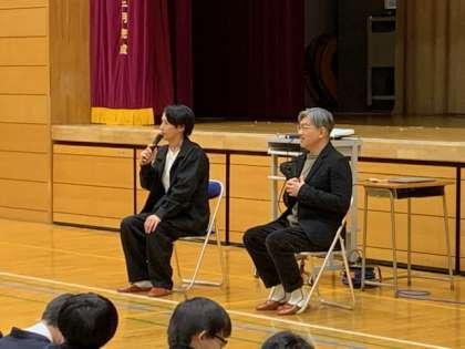 本日は2年生がキャリア教育の一環として職業講話を実施しました。講師はドラマなどで活躍中の俳優の味方 良介様と映画監督で活躍中の豊島 圭介様をお迎えしました。味方様は本校の卒業生です。豊島様は本校の保護者の方です。なかなか聞くことが出来ないお話や、将来に向けた人生設計など貴重ななお話をいただきました。ありがとうございました。お二人のご活躍を期待しています。