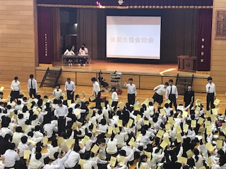 12日に台風で実施できなかった後期生徒総会を本日実施しました。方針は決まりました。次は方針を実現させるため実行力が問われます。