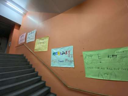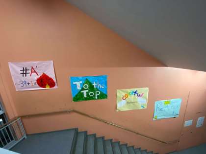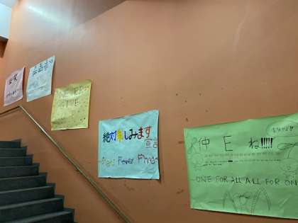 昇降口、階段に各クラスのスローガンを貼っています。スローガンを胸に本番頑張ろう! -