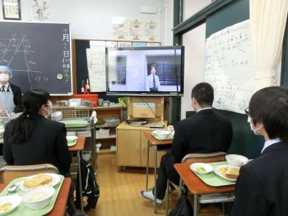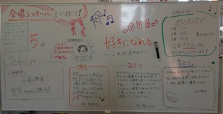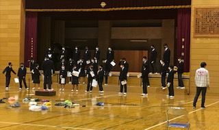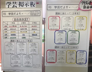 学芸実行委員会の練習管理部で作成した練習動画を給食中に放映しました。「あいうえおあお」の発声練習や腹式呼吸などについて1分程度の長さの動画が7本あり、とても分かりやすい内容になっていました。各クラスの練習の質を向上させる良い機会となりました。