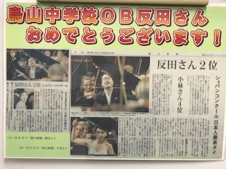 昨日嬉しいニュースが飛び込んできました。烏中OBの反田恭平さんが第18回ショパン国際ピアノコンクールで日本人として約50年ぶりに2位入賞という快挙を成し遂げました。おめでとうございます!今月末には烏中でも合唱コンクールが開催されますが、反田さんが奏でるピアノのように、人の心を動かす音楽(合唱)を目指して練習していきましょう。