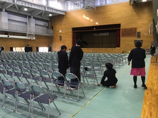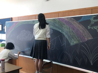 明日の準備が進んでいます。黒板アートや会場準備ボランティアの生徒が着々と準備をしています。