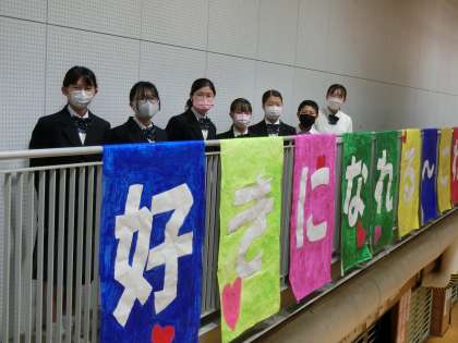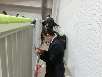 学芸舞台発表会が2日後に迫ってきました。今日は学芸実行委員の広報部が体育館にスローガンを掲示しました。このスローガンはボランティアを募って描いてもらったものです。26名が協力してくれました。