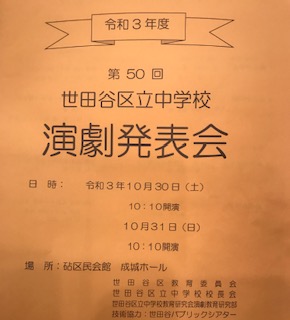 昨年中止となった世田谷区中学校演劇発表会に演劇部が参加しました。今年は感染防止のため、無観客でリハーサルも本番直前に行わなければなりませんでしたが、完成度も高く他校の先生方には好評でたくさんの声をかけていただきました。このところ十分な練習時間は取れなかったはずですが素晴らしい舞台でした。