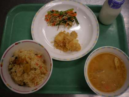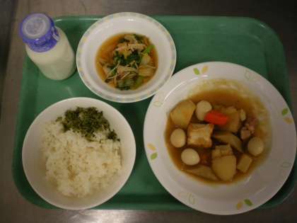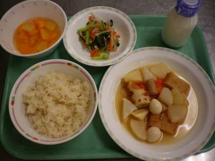 茶めし・洋風おでん・青菜のお浸し・フルーツポンチ