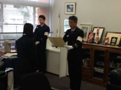 本校生徒会が火災予防運動に協力していることについて、成城消防署長から感謝状が贈られました。