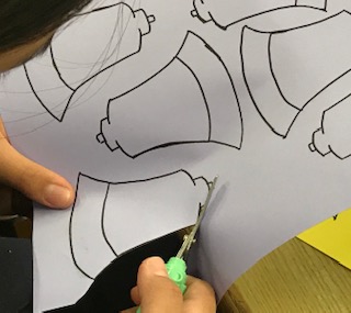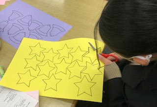 図書委員会ではこれからの読書促進に向けて、委員会でアイデアを出し合い活動しています。様々な形のオーナメントに読んだ本の感想を書きクリスマスツリーに貼り付けるためのオーナメント作りをおこないました。