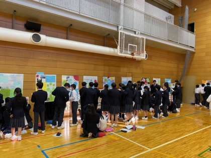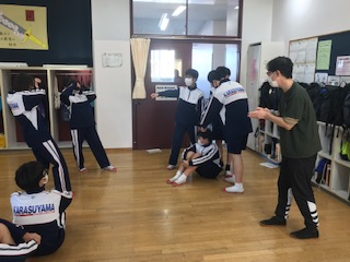 「日本語」の教科書に、演劇が持つ力について考える『世田谷パブリックシアターの考える「演劇ワークショップ」』という単元があります。今日は実際に世田谷パブリックシアターから講師の先生をお招きし、ワークショップを行いました。内容は子供の権利条約の条文を身体を使ってグループで表現するものです。人から見てわかりやすく表現する事はとても難しいことです。アドバイスをもらいながら表現を考え、少しずつ各グループの表現が変わっていくのがわかりました。少しは演劇が持つ力について理解ができたようです。