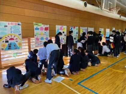 本日6時間目は10月に行った河口湖移動教室の事後学習のまとめです。各班が体験先で学んだことなどを問題にし、模造紙でテストを作りました。各自が移動して、問題を解いています。当日を思い出しながら、楽しそうに取り組みました。