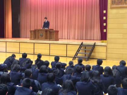 12月9日の4時間目、全校弁論大会が行われました。各学年の代表生徒6名と英語による弁論を行う生徒2名が演台に立ちました。また、この弁論大会は久我山青光学園との交流会を兼ねており、15名の生徒が参観し、1名の代表生徒が弁論を行ってくださいました。
