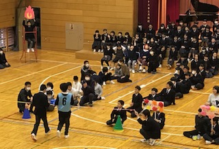 一年生で実行委員会を作り、室内オリンピックを企画して青光学園の一年生約30名を招き、体育館で交流会を実施しました。ゲームを通して楽しい交流会となりました。