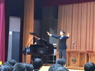 終業式で校歌を歌いますが、今日まで3年生が指揮と伴奏を行ってきました。一年間お疲れ様でした。3学期から2年生にバトンタッチします。 -