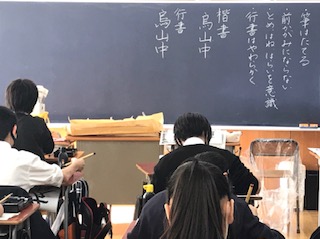 ところで一年の授業でも書写に入り、「書初め」で筆の使い方に取り組んでいます。毛筆を学ぶことで、日頃の文字も丁寧に書くことも目標の一つです。みな真剣に取り組んでいました。 -