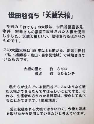 今日の給食は世田谷育ちの大蔵大根を使ったおでんです。大蔵大根が情報学習室前に展示してありましたが、大きくとても立派な大根です。