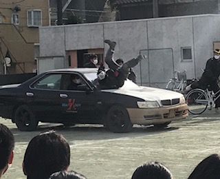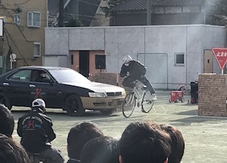 2.3時間目は雨で延期になっていた交通安全教室を実施しました。スタントマンによる交通事故の再現を見ながら、交通事故の怖さを学びました。また、自転車の正しい運転も意識できたようです。、