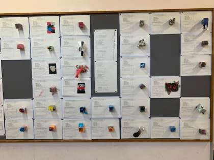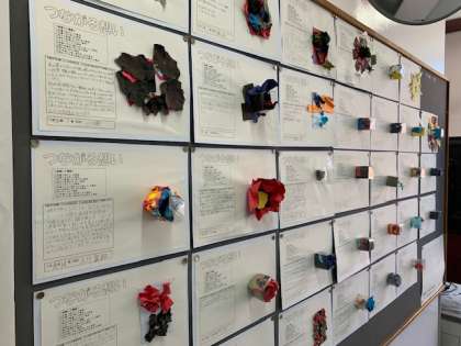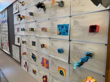 ?1年生の教室の掲示板に作品が飾られています。「東京大空襲による戦争孤児の詩を読んで、主人公の心を形と色で表現しました。」