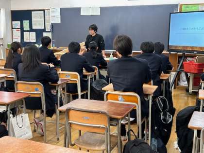大工さん、旅行業者の方のお話の様子です。皆様の笑顔の素晴らしさ、どんな仕事でも考え方は同じ部分があること、今の生活を大切に、様々な経験をすることの大切さなど学ぶことができた、貴重な時間でした。ありがとうございました。