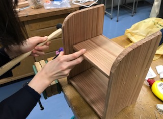 作品展に出品するために、慣れないカンナやキリと格闘しながら製作に励んでいます。 -