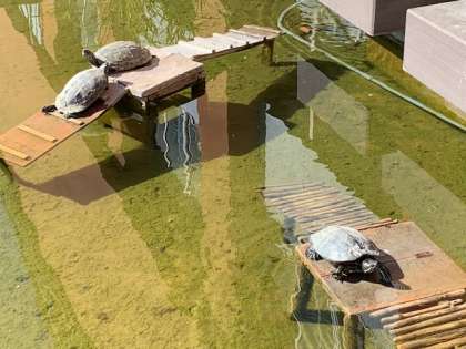 学校の亀が、冬眠していたのですが、この暖かさで甲羅干しをしていました。気持ちよさそうですね。菜の花と一緒に何故かコスモスも咲いています。